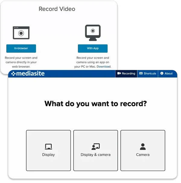 Dank der Mediasite Mosaic Software, einer benutzerfreundlichen Desktop-Aufnahme-App, und Mediasite Capture, einer Webbrowser-Aufnahmelösung, erstellen Sie mühelos leistungsstarke Inhalte mit nur einem Klick.